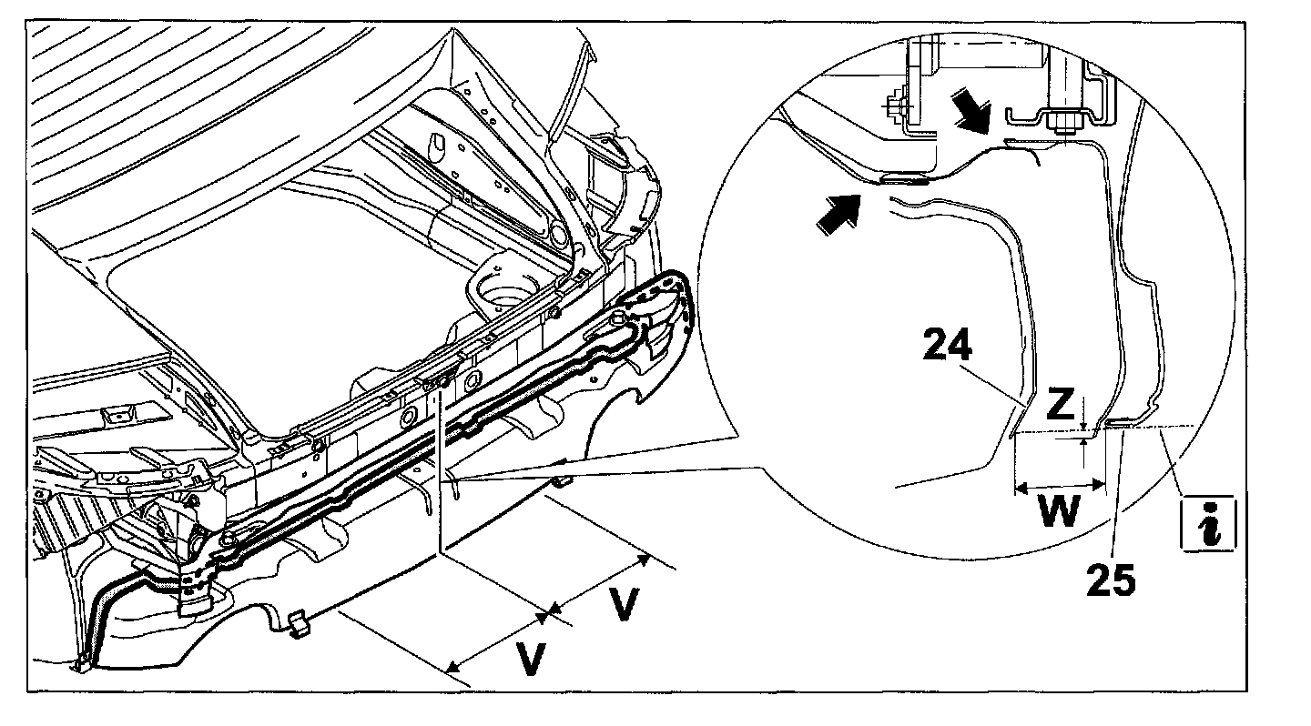 1. After assembly of the rear spoiler, check that there is a gap dimension -W > 50 mm- between the shield of the exhaust system -24- and the lower retaining strip -25-. Check heat shield projection -Z = 0 - 4 mm-.