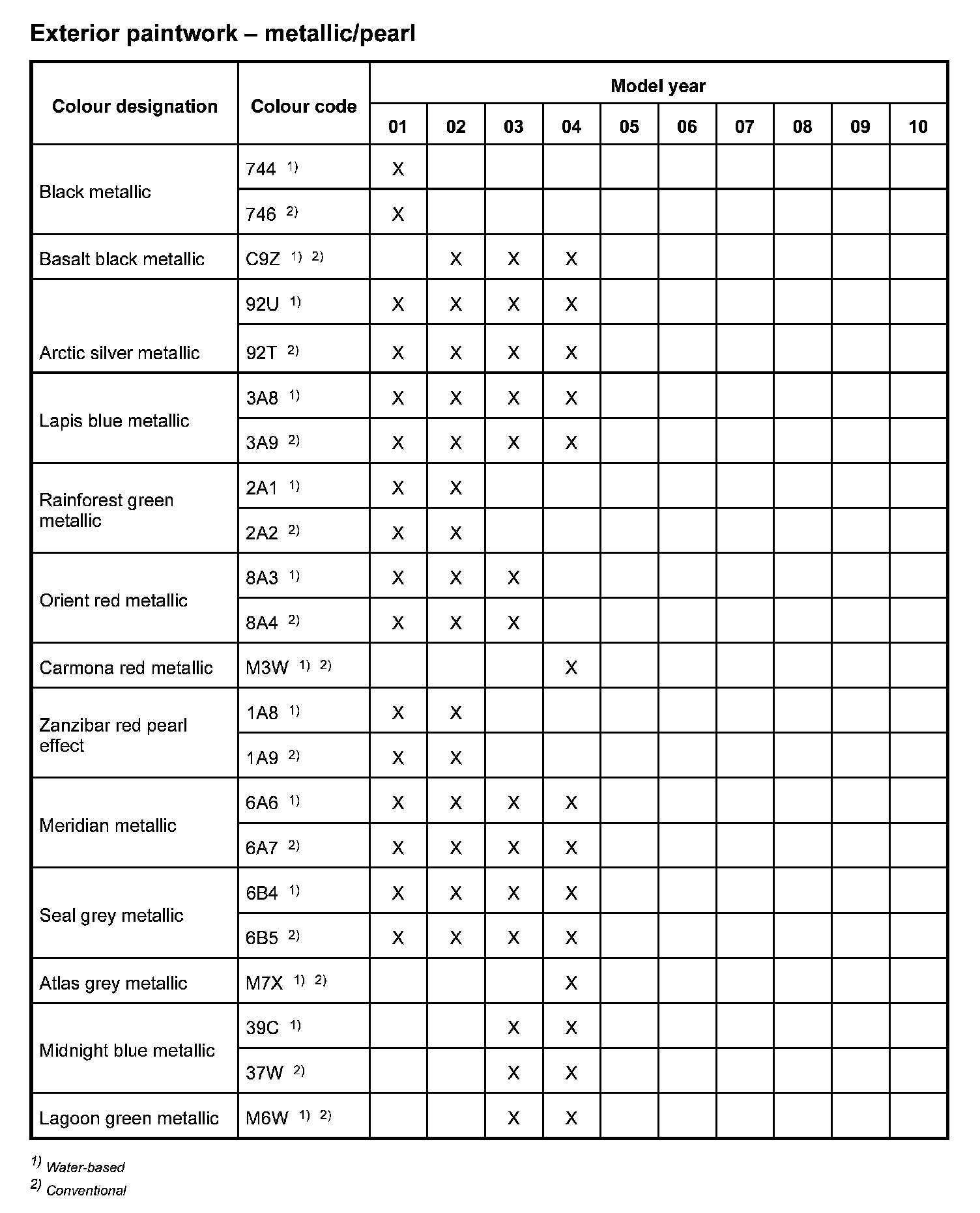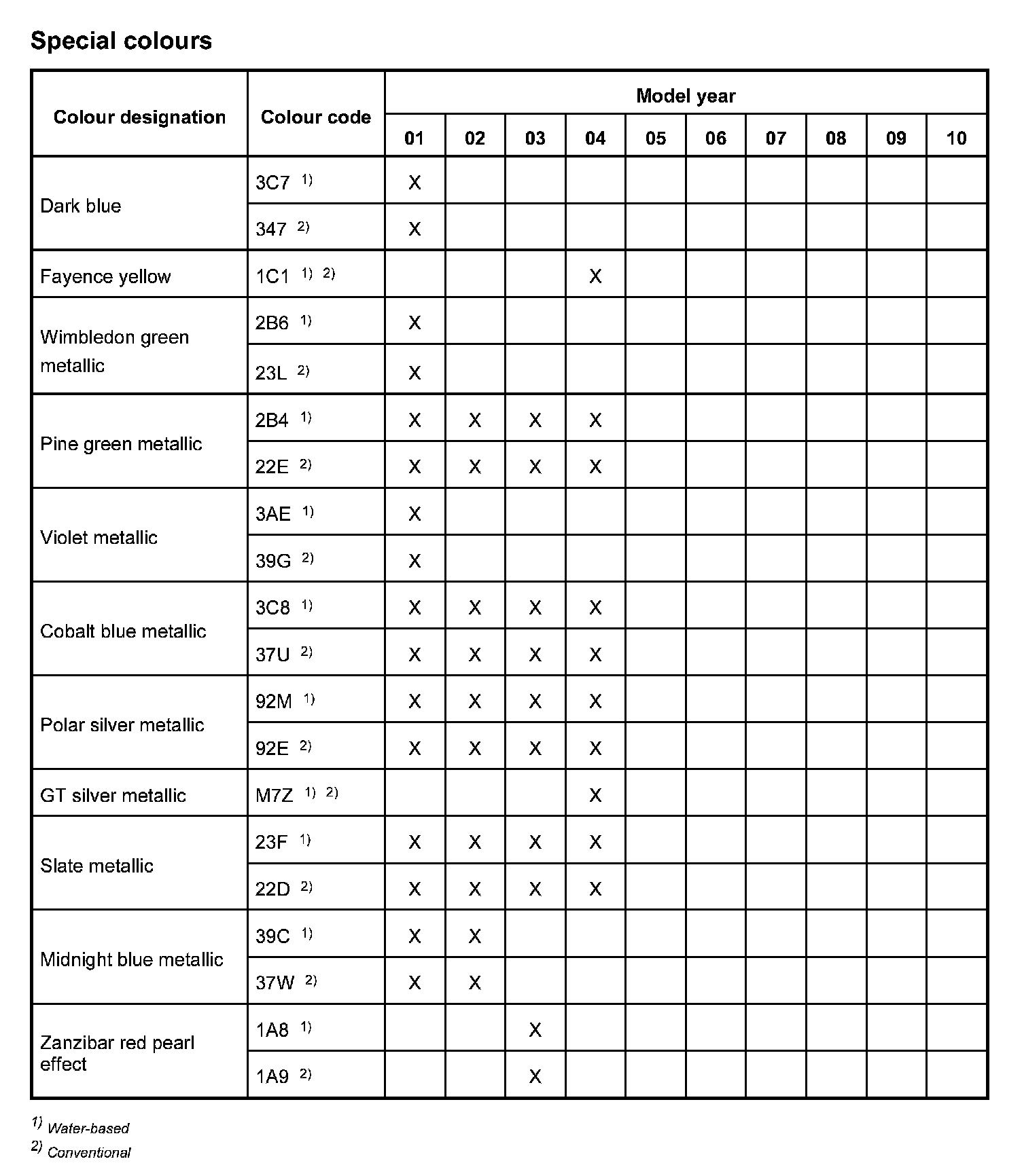 NOTE: As from model year '02, the same colour code will be used for water-based paints and for conventional paints.
