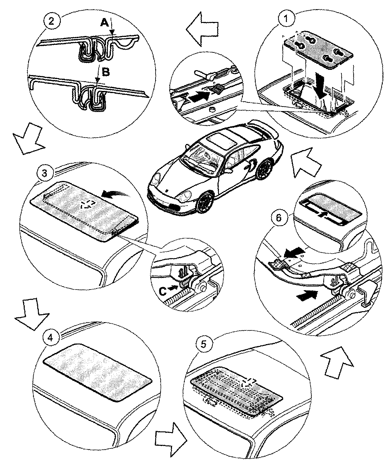 - Pull out the connector springs -B- on the gate and push in sliding/tilting roof trim. Push inner panels under the sheetmetal panel of the sliding/tilting roof trim.