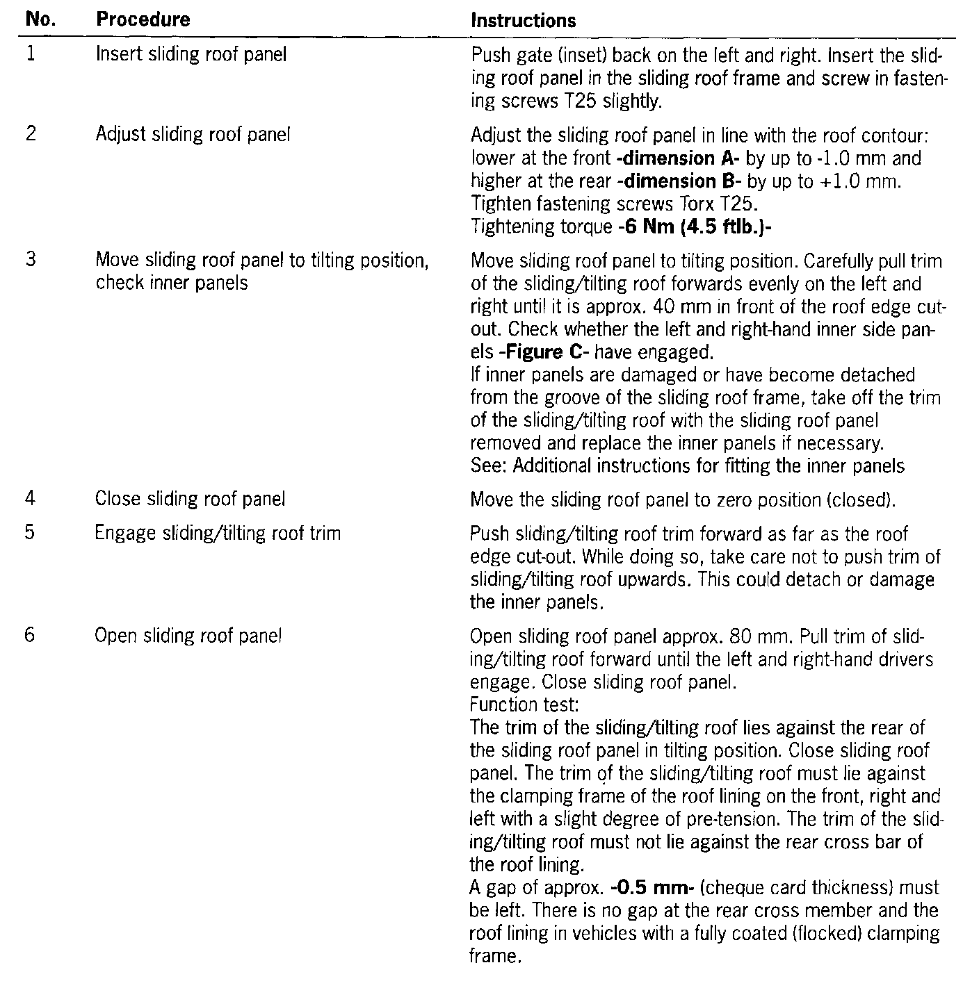 NOTE: The sliding roof panel may be installed in the sliding roof frame only in zero position!