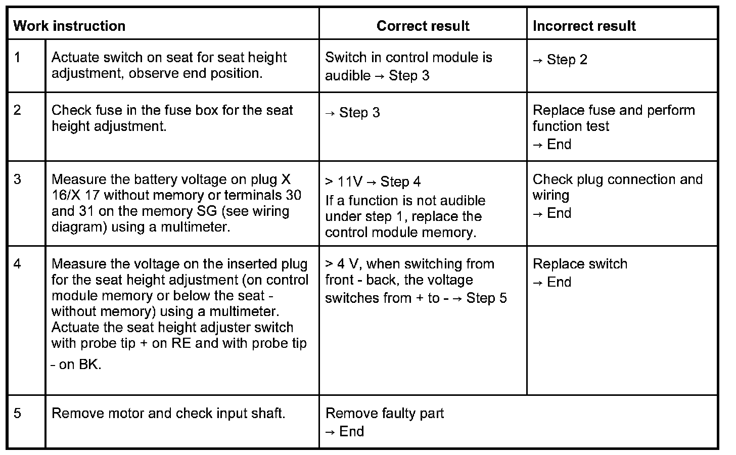 In the case of the complaint "seat height adjustment does not function", proceed according to test plan. As the seat functions vary, the test plan complies with the seat version with seat memory adjustment. Work aids: Use wiring diagram and multimeter -> Tools