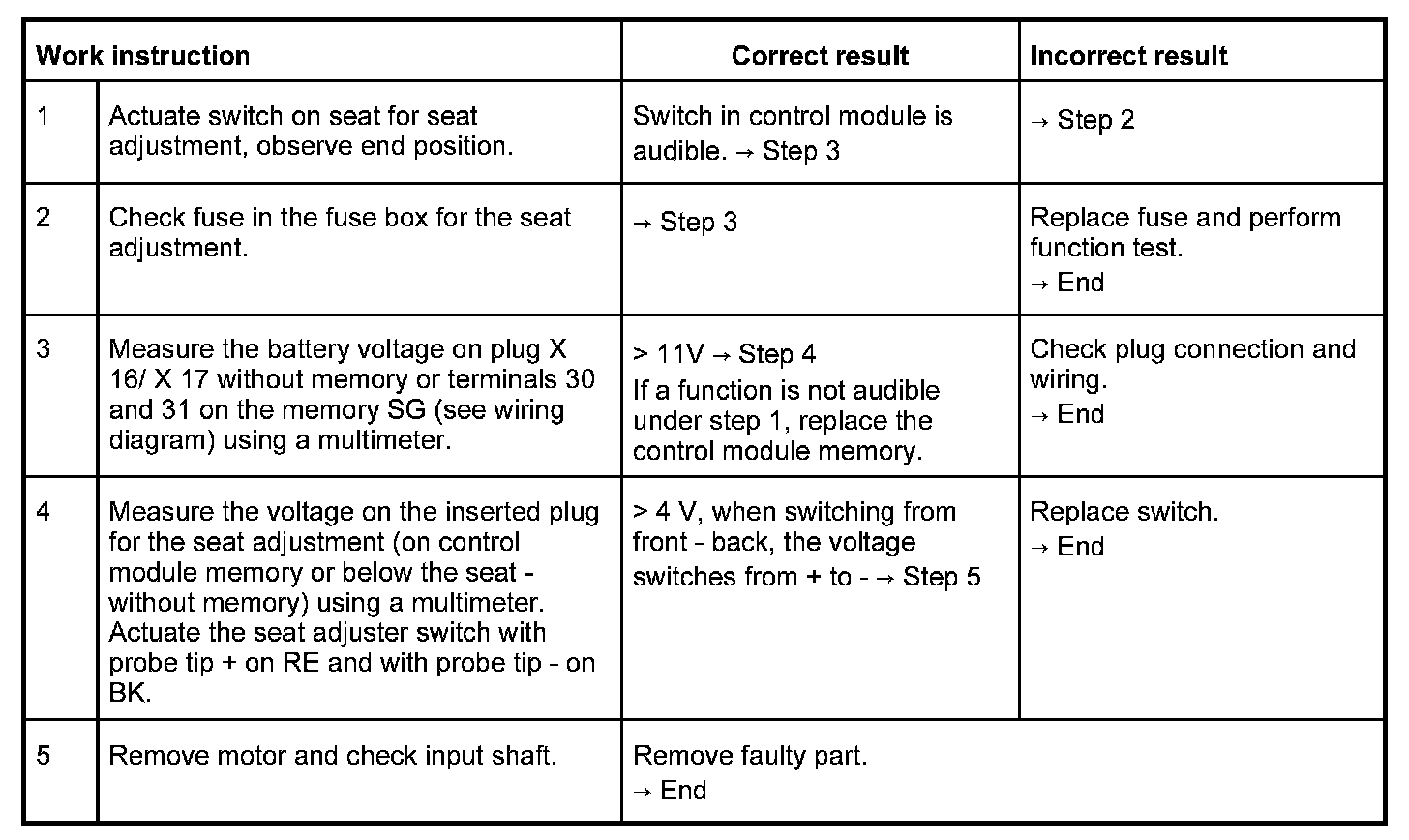 In the case of complaint "seat adjustment does not function", proceed according to test plan. As the seat functions vary, the test plan principally complies with the seat version with seat memory adjustment. Work aids: Use wiring diagram and multimeter. -> Tools