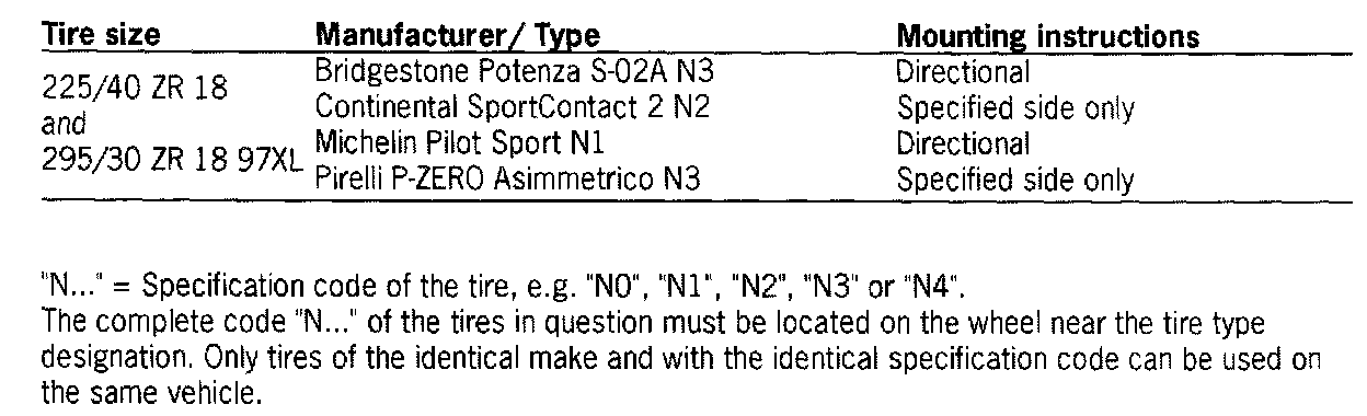If new tires are to be mounted or the tires of one axle are to be replaced tires of the same make, the same type and with the same specification code must always be used on each of the two axles. If tires are replaced on one axle only, the different tread depth from that on the other axle can cause a noticeable change in the familiar handling. This especially the case if new tires are mounted on the rear axle. This effect decreases with increasing tire mileage.