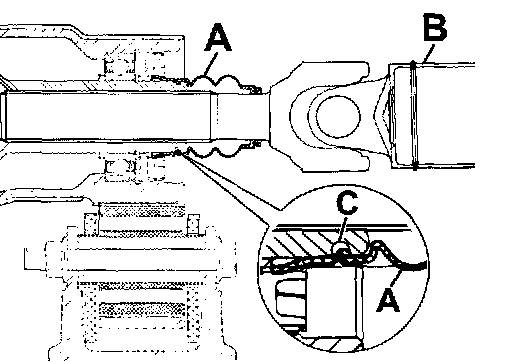 5. Push bellows -A- forward until it engages in the groove -C- of the central shaft. Check whether the bellows is seated properly by pulling on it.