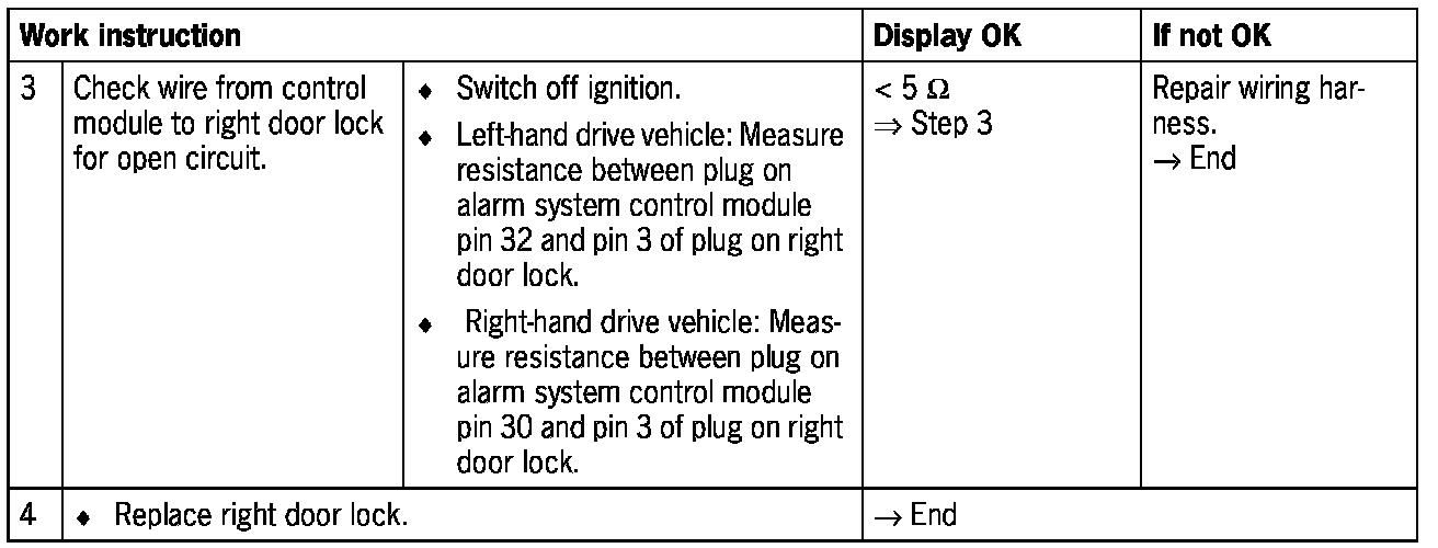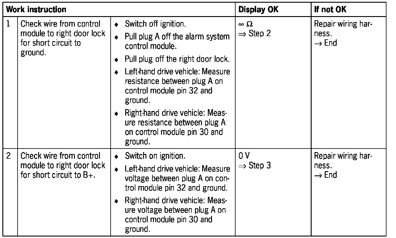 - Short circuit to ground or open circuit in the wiring between the alarm system control module and the right door lock