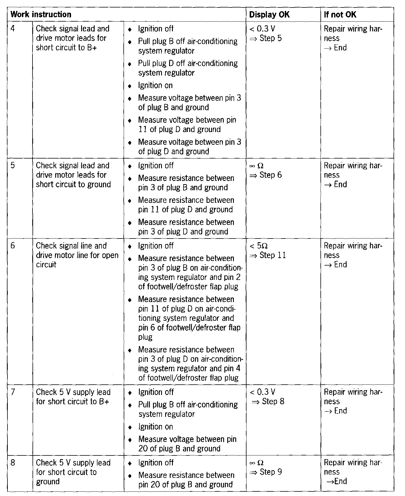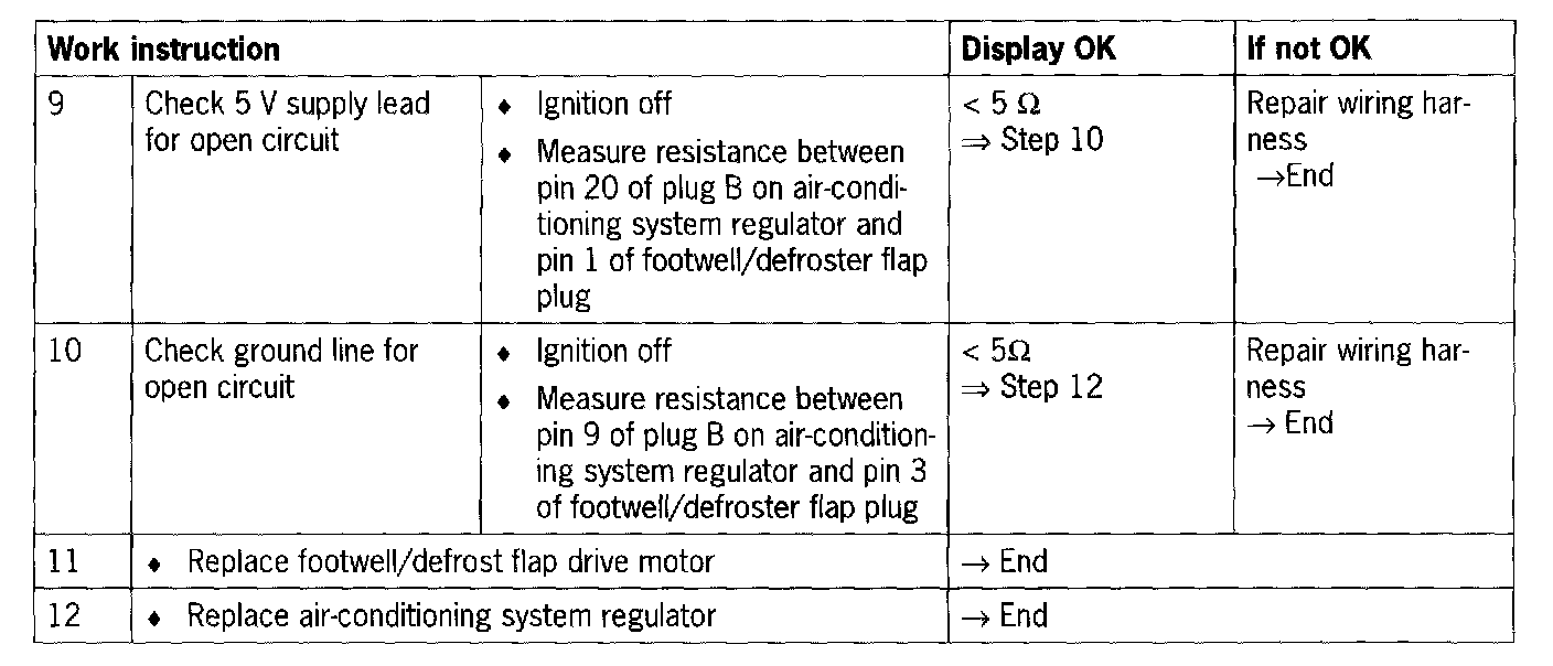 - Short circuit to B+/ground/between wires or open circuit in wiring between air-conditioning system regulator and footwell/defroster flap