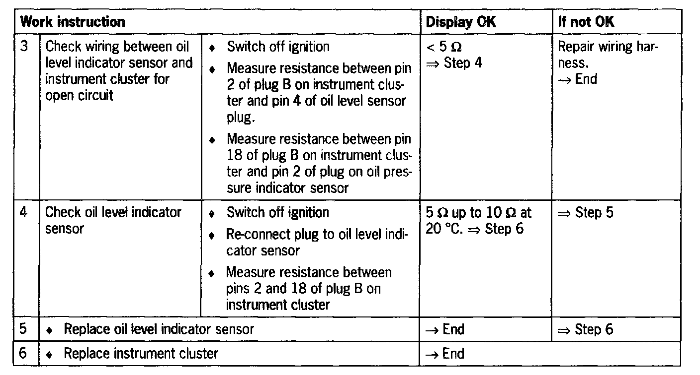 - Short circuit to B+/ground or open circuit in wiring between oil level indicator sensor and instrument cluster