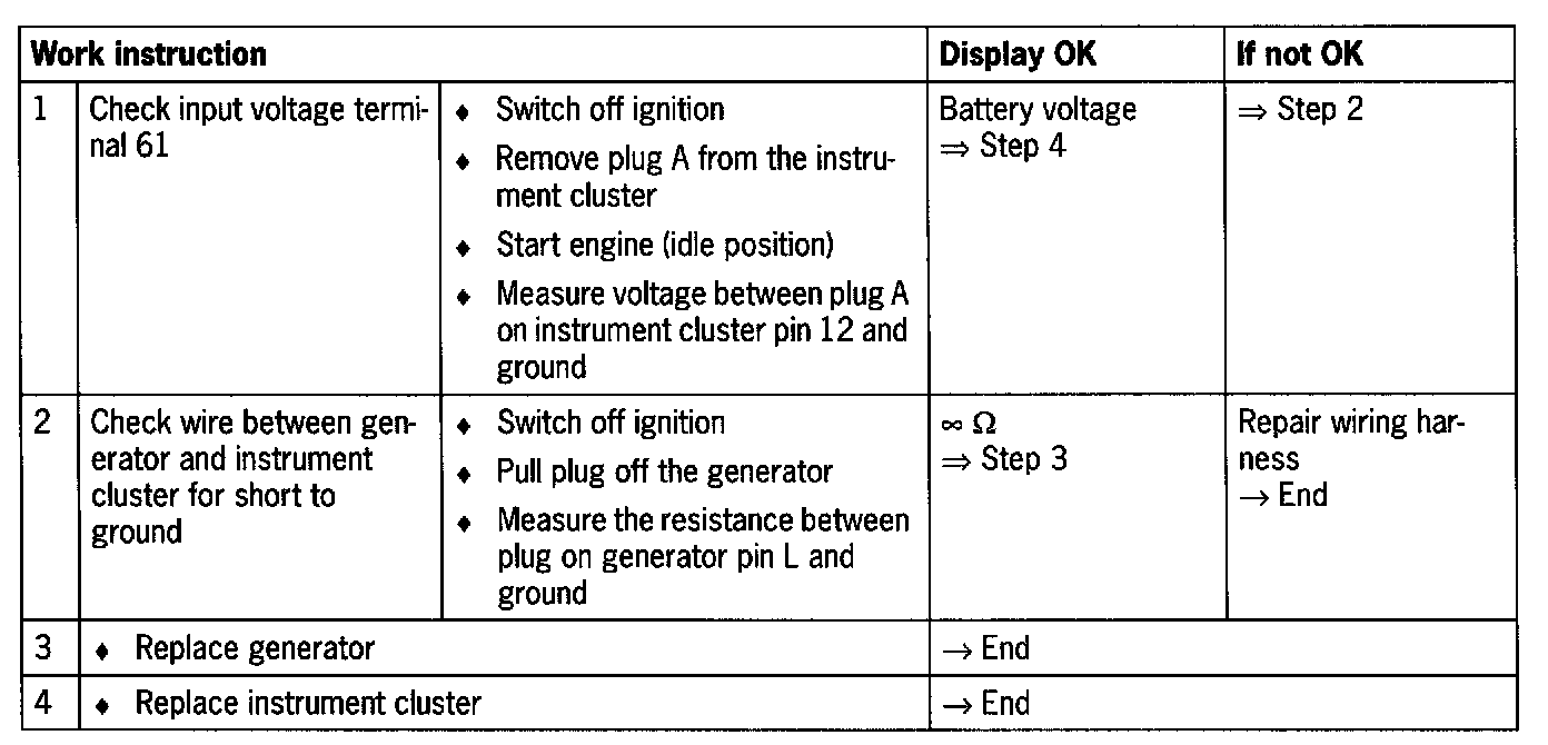 - Short circuit to ground in the wire between instrument cluster and generator (terminal 61)