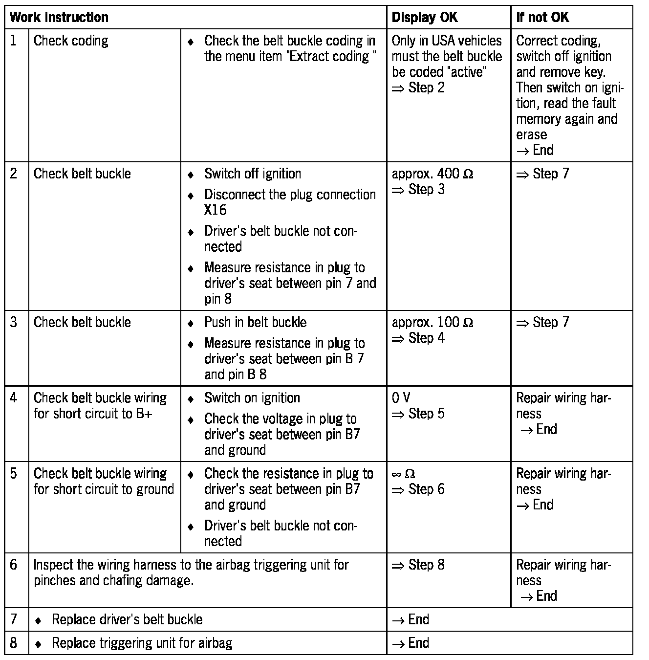 - Short circuit to B+/ground or open circuit in the wiring between the driver's belt buckle and the airbag triggering unit