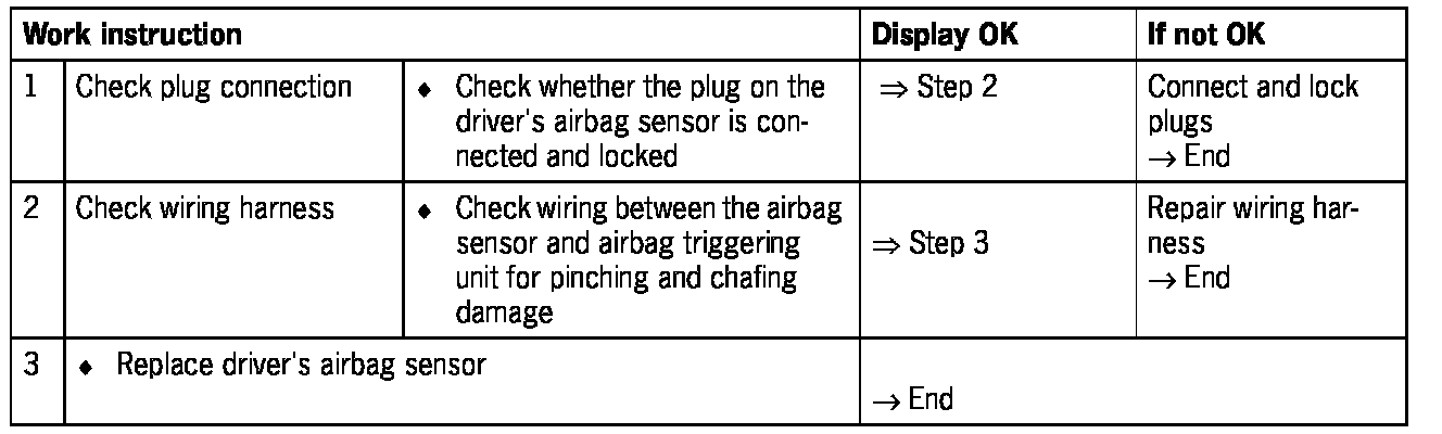 - Short circuit to B+/ground or open circuit in the wiring between the driver's airbag sensor and the airbag triggering unit