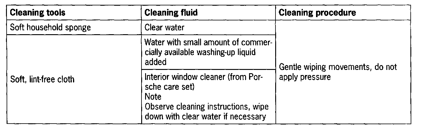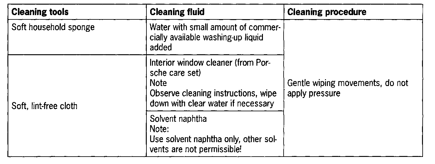 Damage to the soft-look paint coat if the cleaning agents or solvents available as accessories for cleaning the vehicle interior are used. This also applies to the use of plastic polish 999.901.021.41 from the Porsche care set.