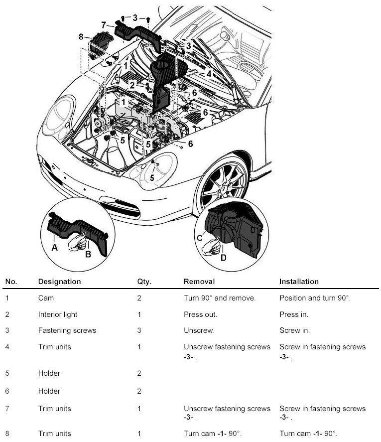 INFORMATION: When replacing the trim units -4, 7- the recesses -A, B, C, D- must be knocked out in accordance with the vehicle equipment.