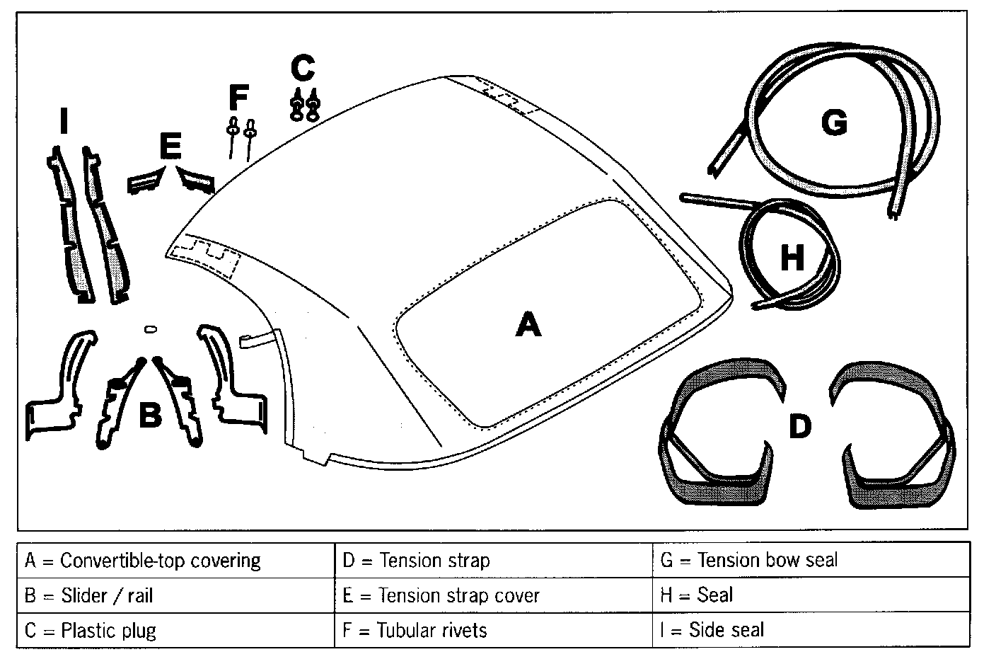 - The convertible-top covering spare parts shown are required for replacement of the convertible-top covering!