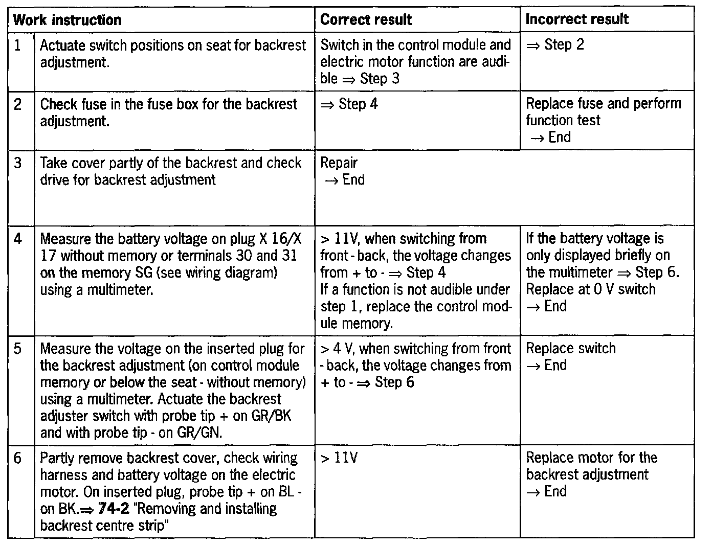 In the case of the complaint "backrest adjustment does not function", proceed according to test plan. As the seat functions vary, the test plan principally complies with the seat version with seat memory adjustment. Work aids: Use wiring diagram and multimeter.