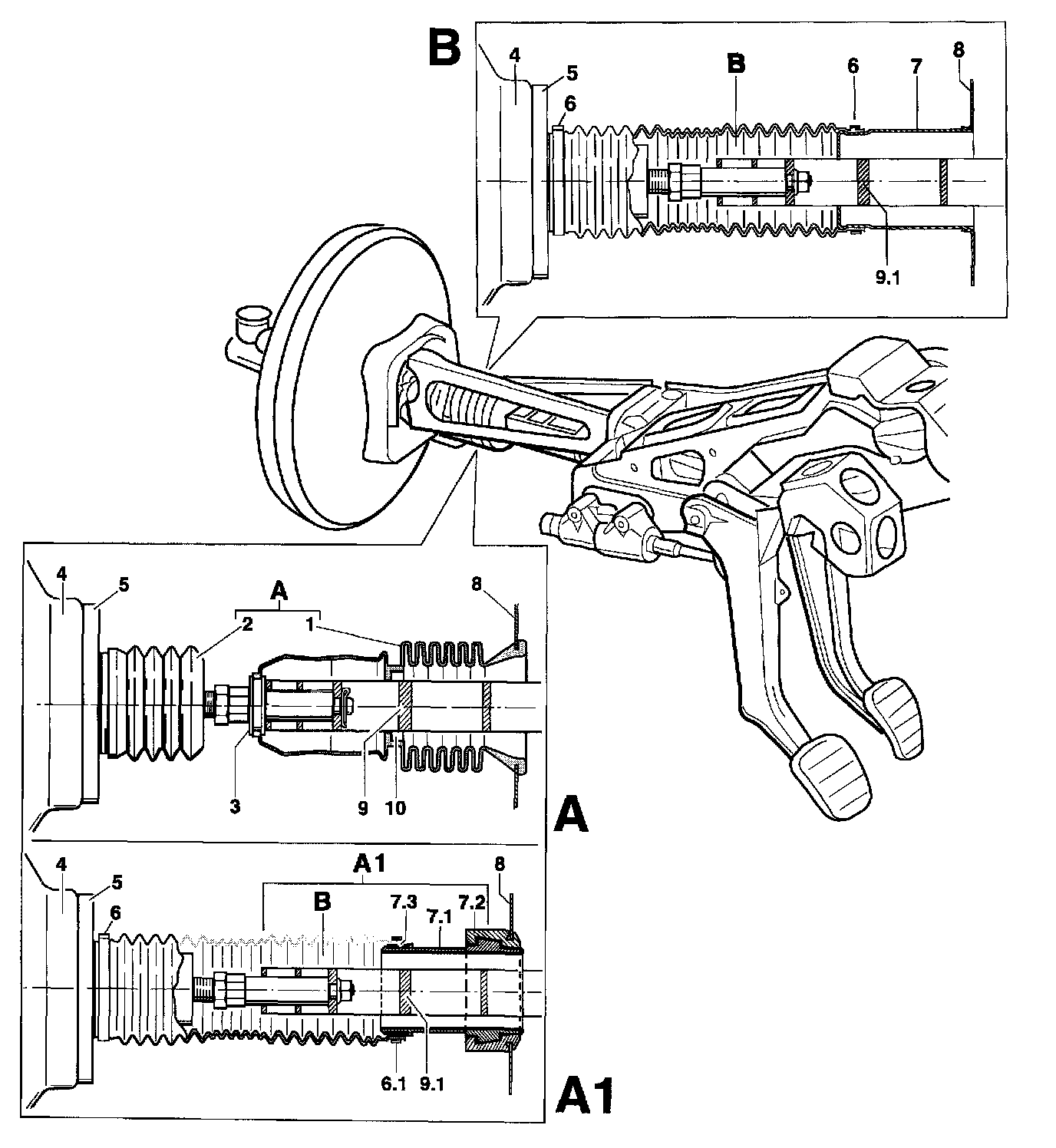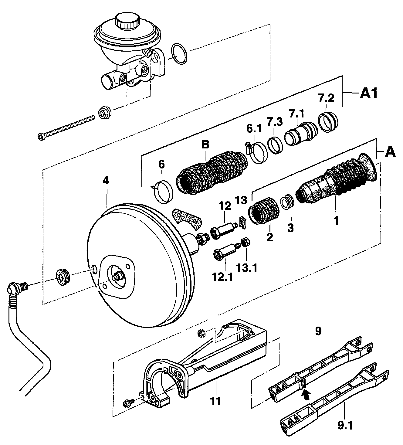 ^ To convert the bellows variant -A- to version -A1- the hydraulic unit, the brake booster -4- with brake master cylinder and the intermediate piece -11- must be removed.