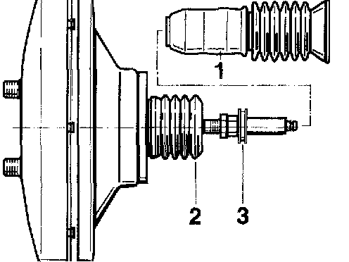 6. Remove the bellows -1- on the fire wall and the bellows -2- on the brake booster. Pull off the grommet (rubber groove ring) -3-.