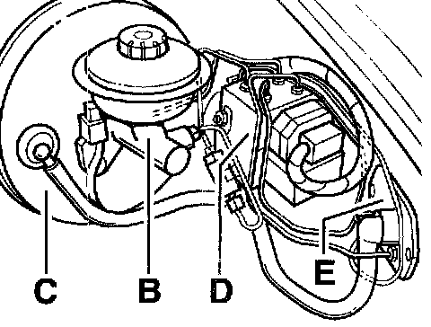 ^ The assembly of the brake master cylinder -B- with the brake booster -C- must not be disconnected for removal and installation if both parts should be continued to be used!