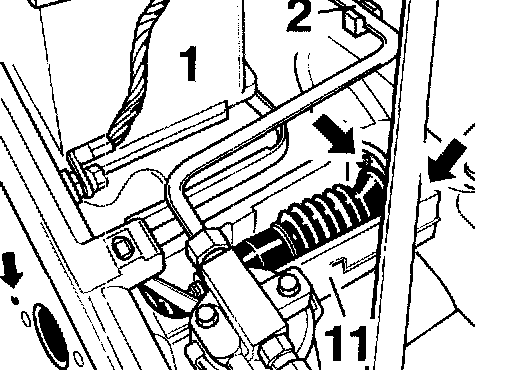 - Remove short bellows -2- on the brake booster and the long bellows -1- on the firewall.