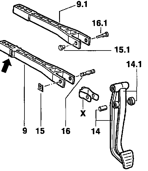 ^ Installation of the new brake pedal -14.1- is necessary as the connection to the push rod in model '97 -9- is made with a pin (self-aligning bolt) -16- with a mechanical locking device -15-. Connection as of '98 model: Threaded bolt -16.1- with threaded bushing -15.1-.