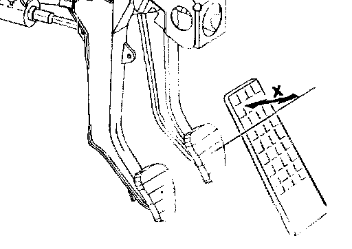 10. Check the position of the brake pedal -Dimension X = 45 + 5 mm-. Perform measurement between the center of the brake pedal plate and the accelerator. Perform a fine adjustment of the brake pushrod if the correct position of the brake pedal is not given.