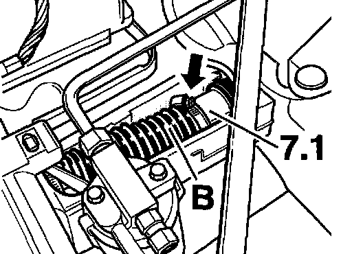 12. Fit the bellows -B- to the connection sleeve -7.1- and secure with the screw clamp -arrow-.