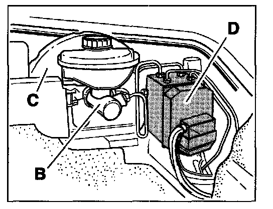- The brake master cylinder -B- and the hydraulic unit -D- must be removed to remove and install the brake booster -C-.