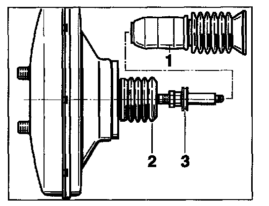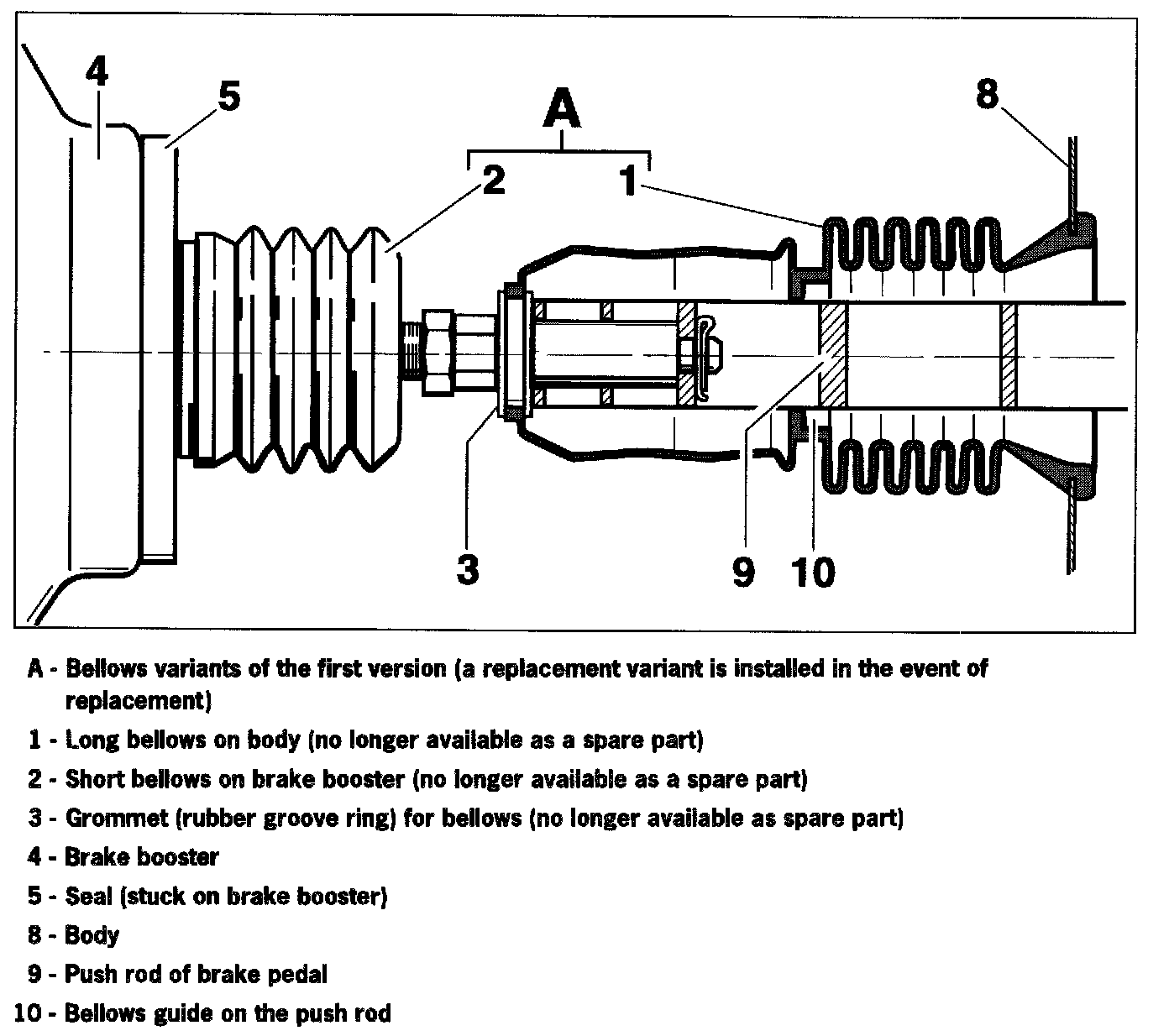 The 2 rubber bellows -1 and 2- on the brake booster and on the body are no longer available for vehicles with bellows variant A (first version).