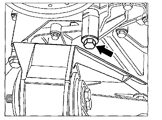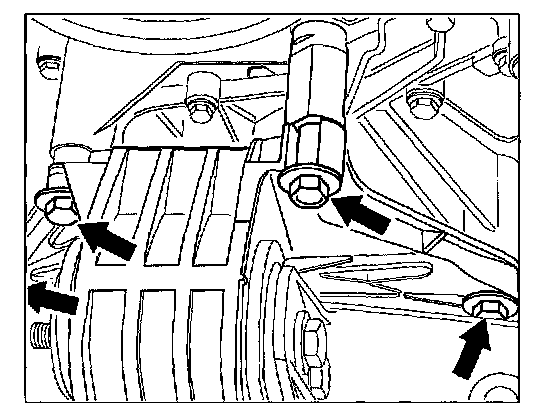 - Coolant guide housing with 4-point screw connection and engine bracket with 3-point screw connection. The additional bolting point at the upper right-hand side -arrow- on the coolant guide housing is fastened with a hexagon-head bolt M10 x 60.