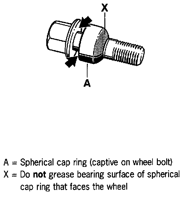 Do not coat the spherical cap surface of the wheel bolts that faces the wheel (X).