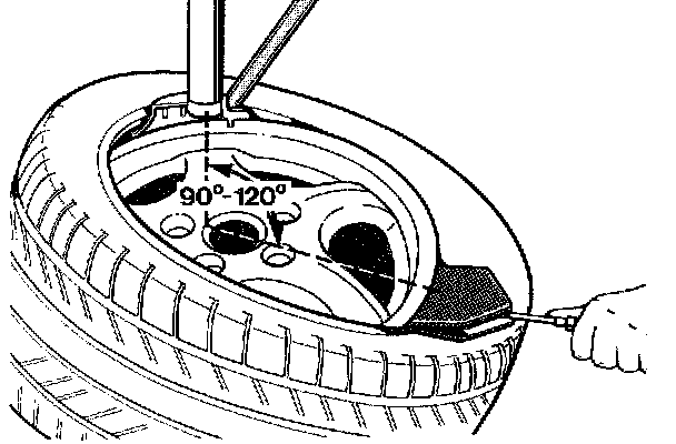 - At the start of the mounting process for the second bead, the mounting arm should be positioned opposite to the valve. Then place the second tire bead on the tire as flat as possible, guide over the mounting head and hold down offset by approximately 90 - 120° with special tool 9539.