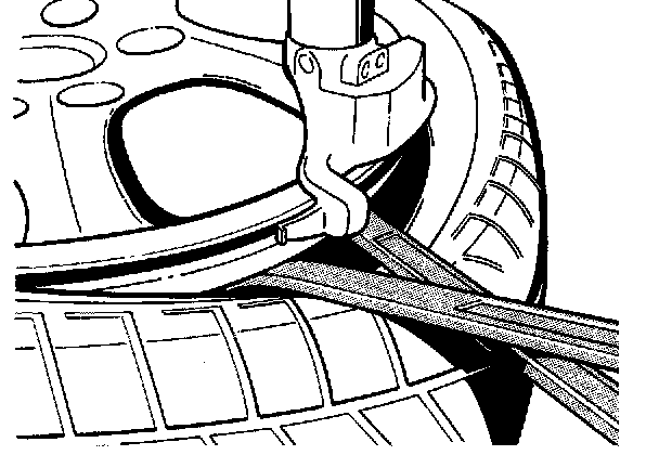 - Lift the first side of the tire over the mounting head (Figure 537_97). Place a cloth or piece of leather between the wheel and mounting lever. Furthermore, make sure that the tire is held in the well base opposite to the removal head.