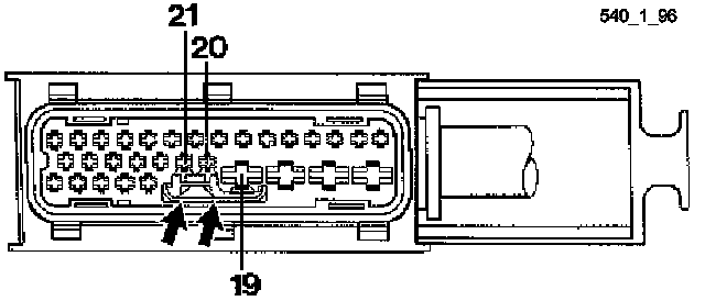 - Mechanical switching contacts (arrows) in the control module connector bent. As a consequence, these contacts are permanently connected to ground (ground of PIN 19 connected to PIN 20 and PIN 21).