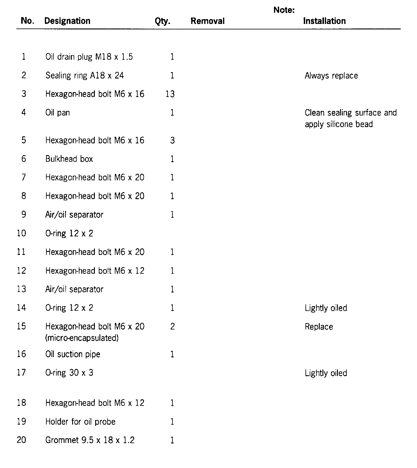 3. Place the oil pan in the correct position carefully, so that the sealing bead is not damaged. Screw two studs or centering pins into the corners of the crankcase housing halves as centering aids.