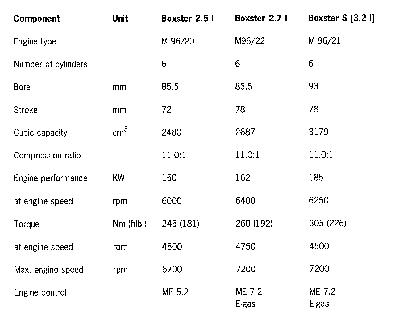 Differences between Boxster 2.5 l, 2.7 l and Boxster S (3.2 l) engines