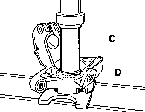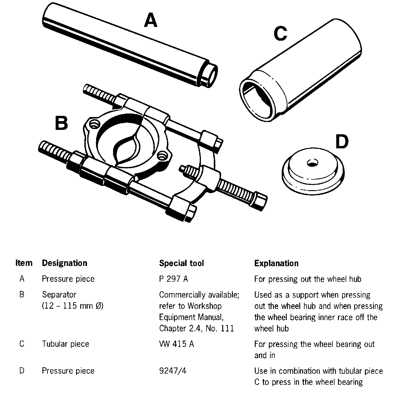- Heat wheel bearing housing to approximately 100° C (max. 120° C). Insert new wheel bearing, and then press again slightly using pressure piece 9247/4 (tool D) and tubular piece VW 415 A (tool C).