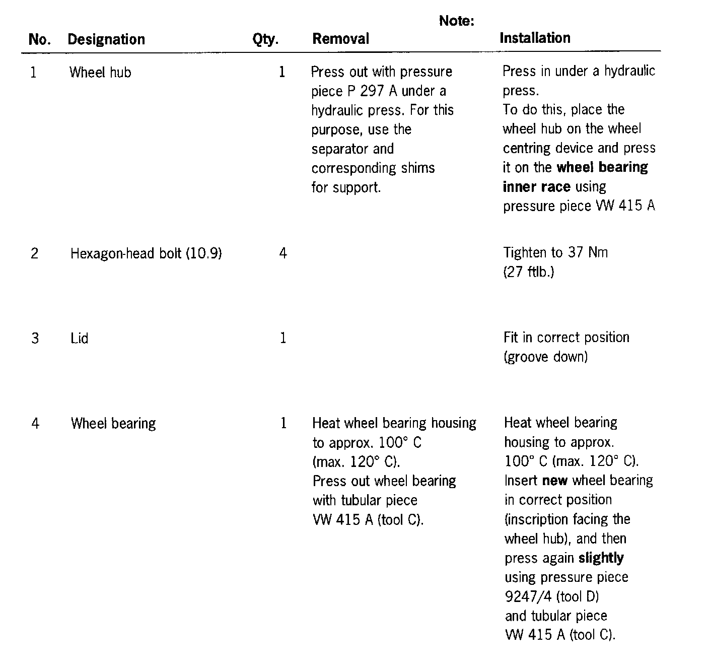 To do this, place the wheel hub on the wheel centering device and press it on the wheel bearing inner race using pressure piece VW 415 A (tool C).