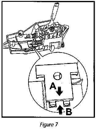 Press green clip downwards --> Figure 7 -Arrow A- and unclip it towards the front --> Figure 7- Arrow B- out of the gearshift bracket.