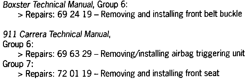 13.1 Remove the previous belt buckle; see Boxster Technical Manual, Group 6, Repairs, 69 24 19 - Removing and installing the front belt buckle.