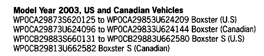 This is to inform you of a voluntary Workshop Service Action on certain 2003 model year Boxster and Boxster S vehicles, equipped with key remote control (keyless entry) system. The remote release of luggage compartment and/or doors will not function at times. Faulty internal key remote transmiller drivers for the 315 MHz remote control will cause this condition.