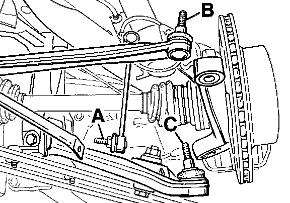 6. Detach stabilizer/stabilizer mount ball joint (A), toe control arm (B) and control arm (C) from wheel carrier, Disassembling and assembling wheel suspension).