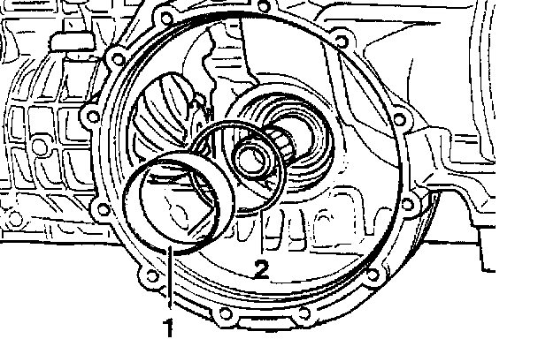 13. Take differential, bearing outer race (1) and adjusting shim (2) out of the transmission housing by hand.