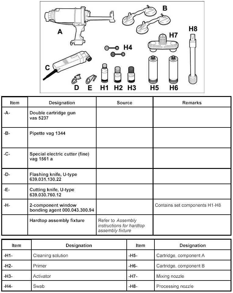 The following tools and materials are required for removal and installation of the rear window with 2-component adhesive: