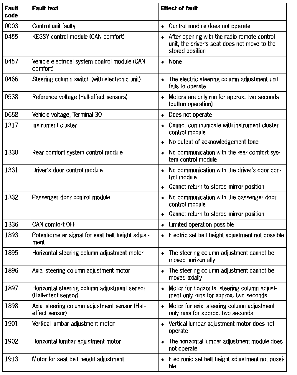 Fault Overview - Seat Adjustment Memory (Part 1):
