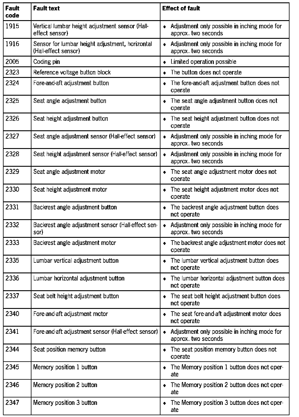 Fault Overview - Seat Adjustment Memory (Part 2):