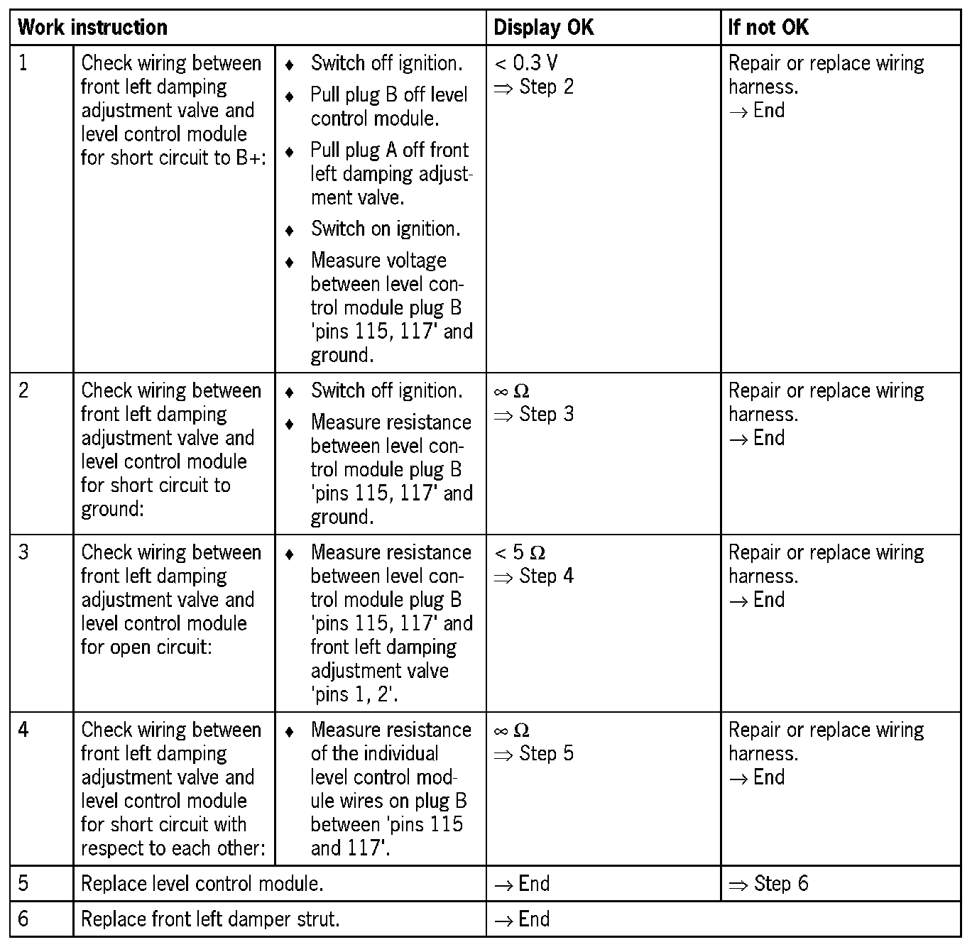- Short circuit to B+ or open circuit in the wiring of pin 117 of the level control module (electrical fault in electric circuit)