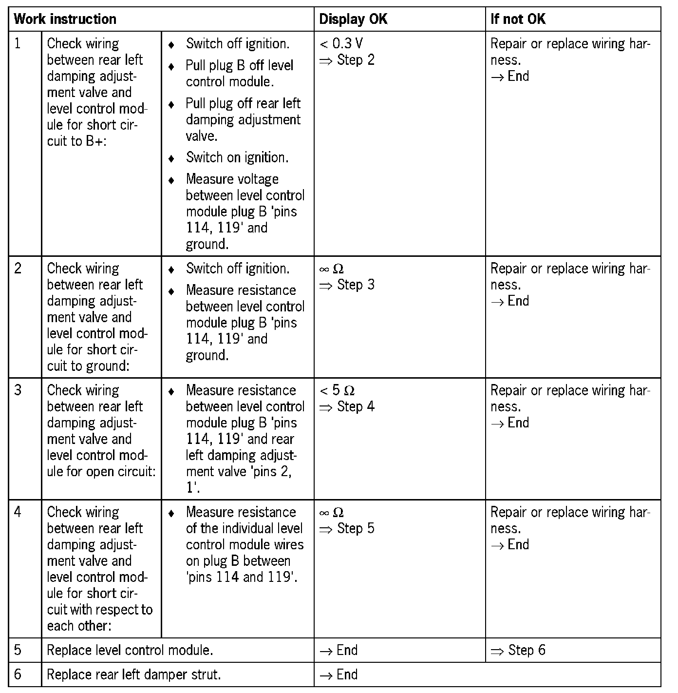 - Short circuit to B+ or open circuit in the wiring of pin 114 of the level control module (electrical fault in electric circuit)