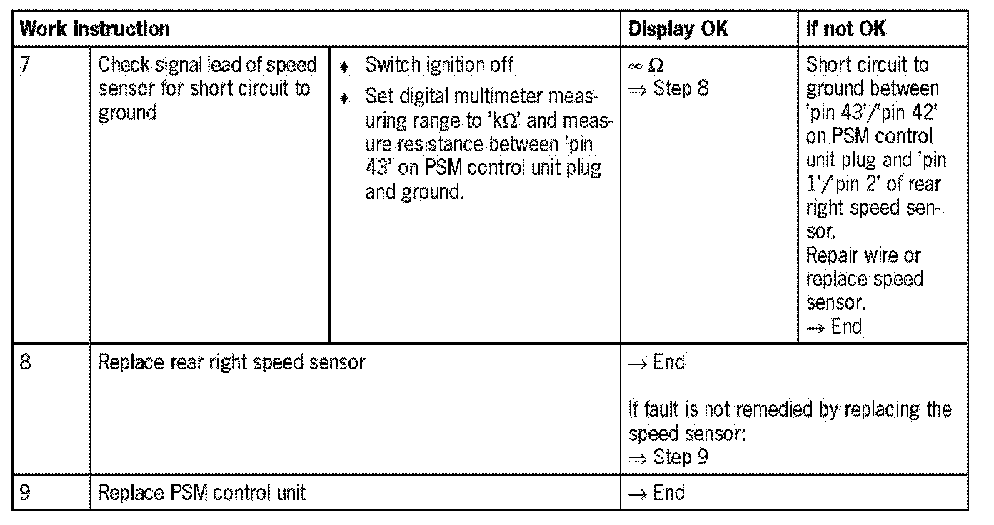 Visual inspection: In the next troubleshooting section, please check first that the affected 'pins' on the PSM control unit plug connection and the 'pins' on the speed sensor plug connection are neither damaged nor corroded. Check the speed sensor, multiple-pole ring on the wheel bearing and the rear right wire for external damage. Remove any soiling or corrosion/oxidation. Replace damaged parts. Cables '12/13/35' from measurement tool set No. 9684 are needed for measuring the current on the speed sensor.
