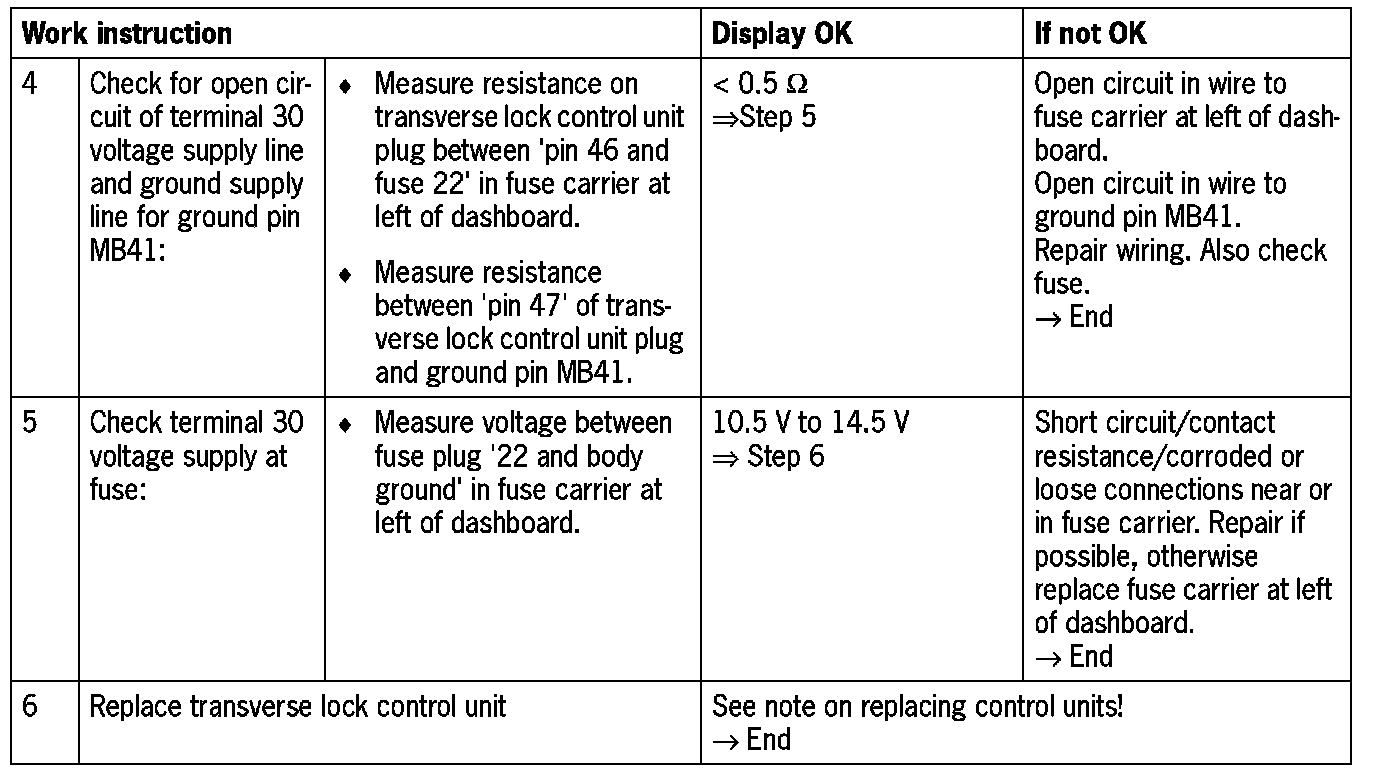 Before carrying out the work instruction, please check fuse '22', terminal 30 power supply for the transverse lock control unit, in the fuse carrier at the left of the dashboard and replace it if necessary. After replacing the fuse, determine and remedy the cause of the fault in accordance with the work instruction below.