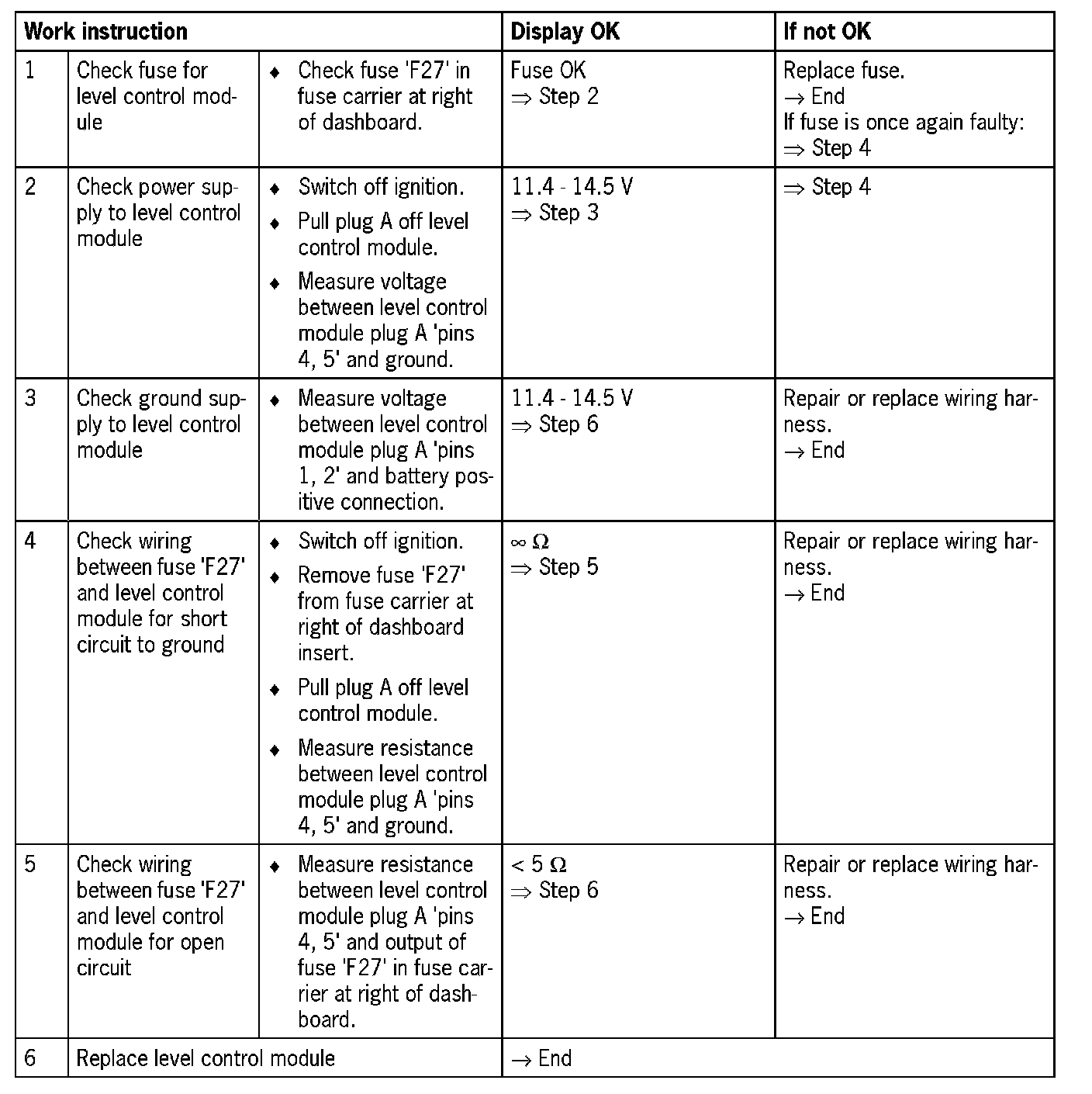 - Short circuit to ground or open circuit in pin 4 and/or pin 5 of the level control module wiring