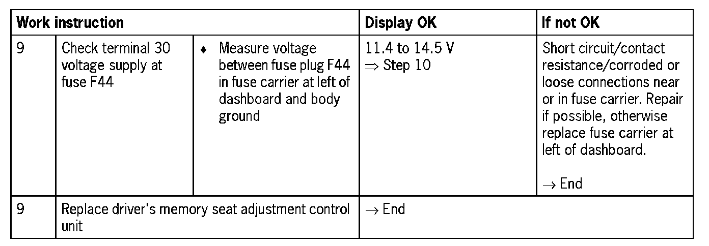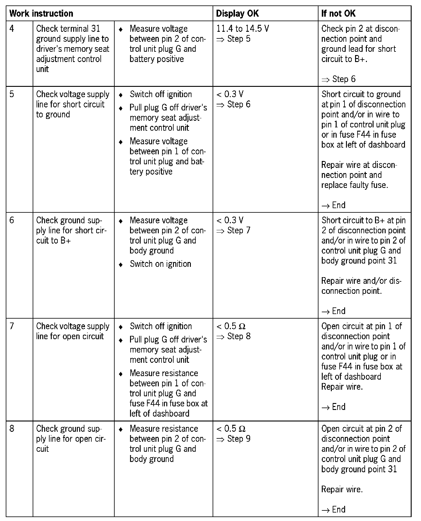 Visual inspection: In the next troubleshooting section, first check that the affected pins on the driver's memory seat adjustment control unit plug connection are not damaged or corroded. The wiring and plugs of the affected components must also be checked for external damage and correct contact. Repair damaged or corroded pins if possible, otherwise replace affected pins. Repair or replace damaged wires.